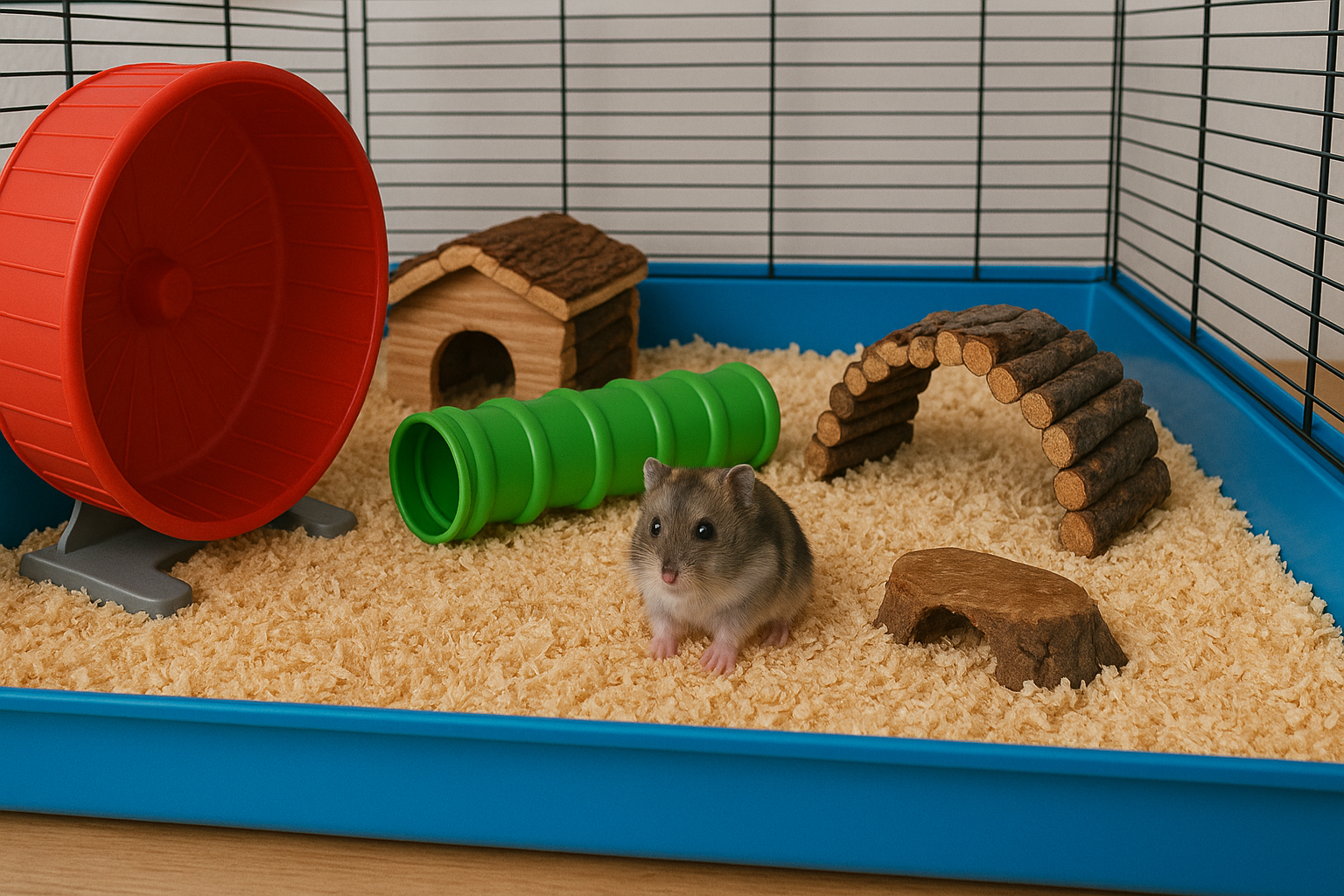 - Klatka i wyposażenie – minimalne wymiary klatki dla chomików dżungarskich to 60×40 cm, ale większa przestrzeń sprzyja ich aktywności. W klatce niezbędne są elementy takie jak kołowrotek (o średnicy co najmniej 20 cm, aby zapobiec deformacjom kręgosłupa), tunele, kryjówki i miejsca do wspinaczki. Podłoże powinno być miękkie, np. wióry bezpyłowe lub specjalistyczne ściółki dla gryzoni.